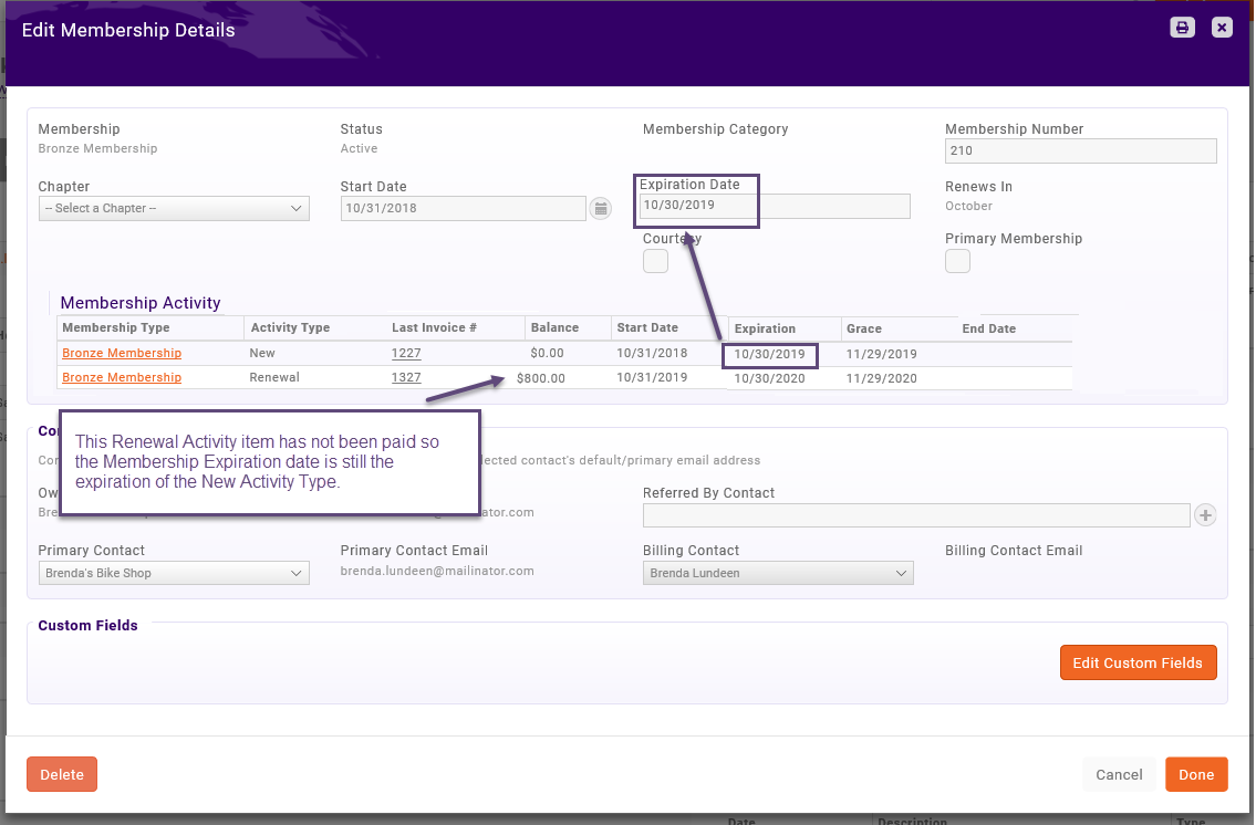 Already now, when membership invoices are paid or a credit applied, the Membership Expiration date is updated with the expiration date of the Renewal Activity item. But once the additional details display on the Membership Details screen, you'll be able to better visualize the activity that caused the expiration date to advance. See screenshot of the updated Membership Details screen.