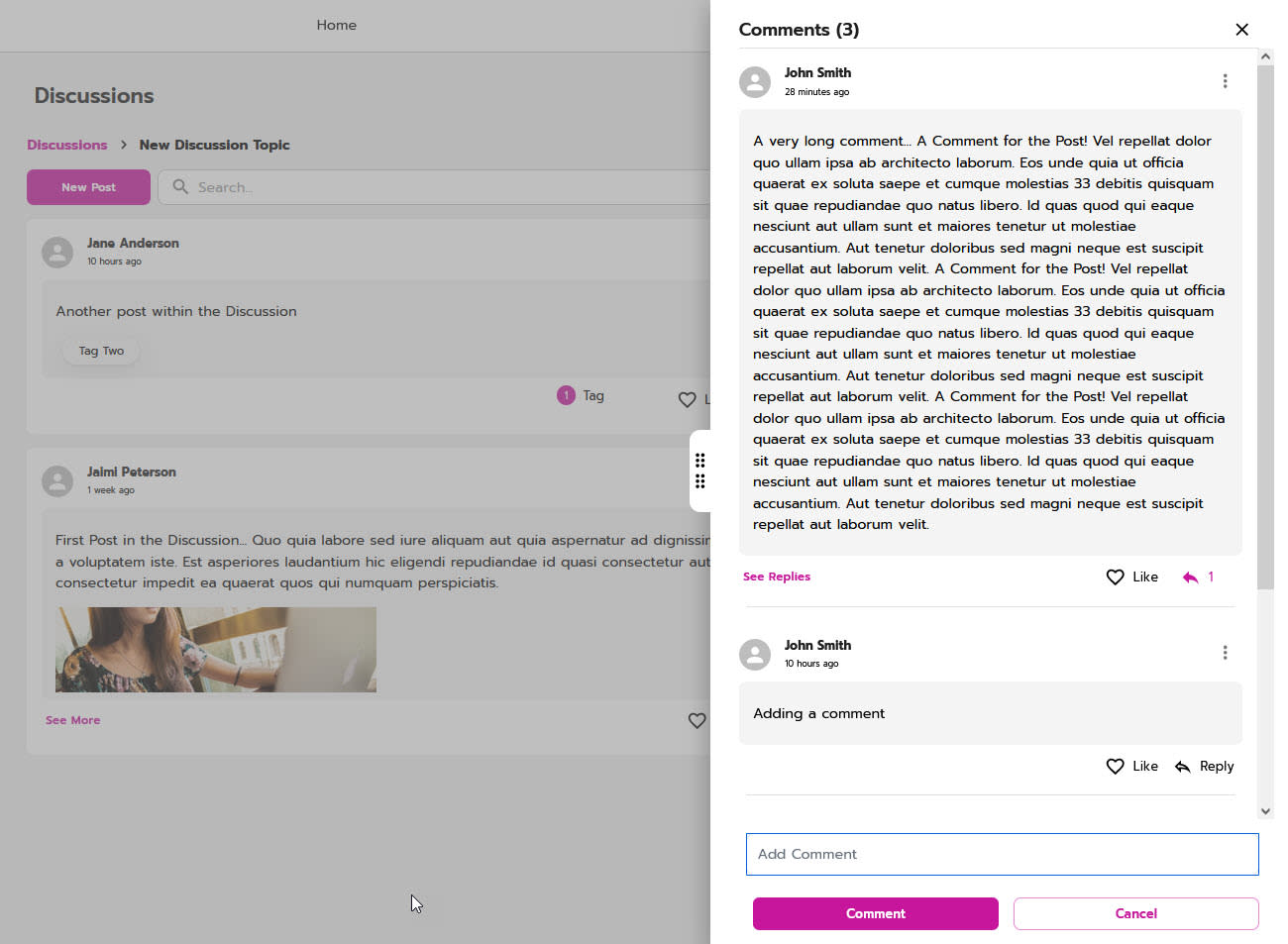 The new drawer design allows users to engage with the discussions and posts in a way where the main items remain in view, making it easier to reference post details when adding comments or replies.