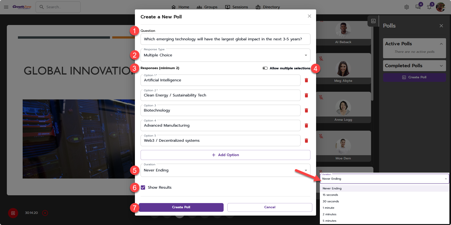 - Select a poll duration, which determines how long the poll remains active before automatically ending. (note: organizers and moderators can end a poll early at any time.)