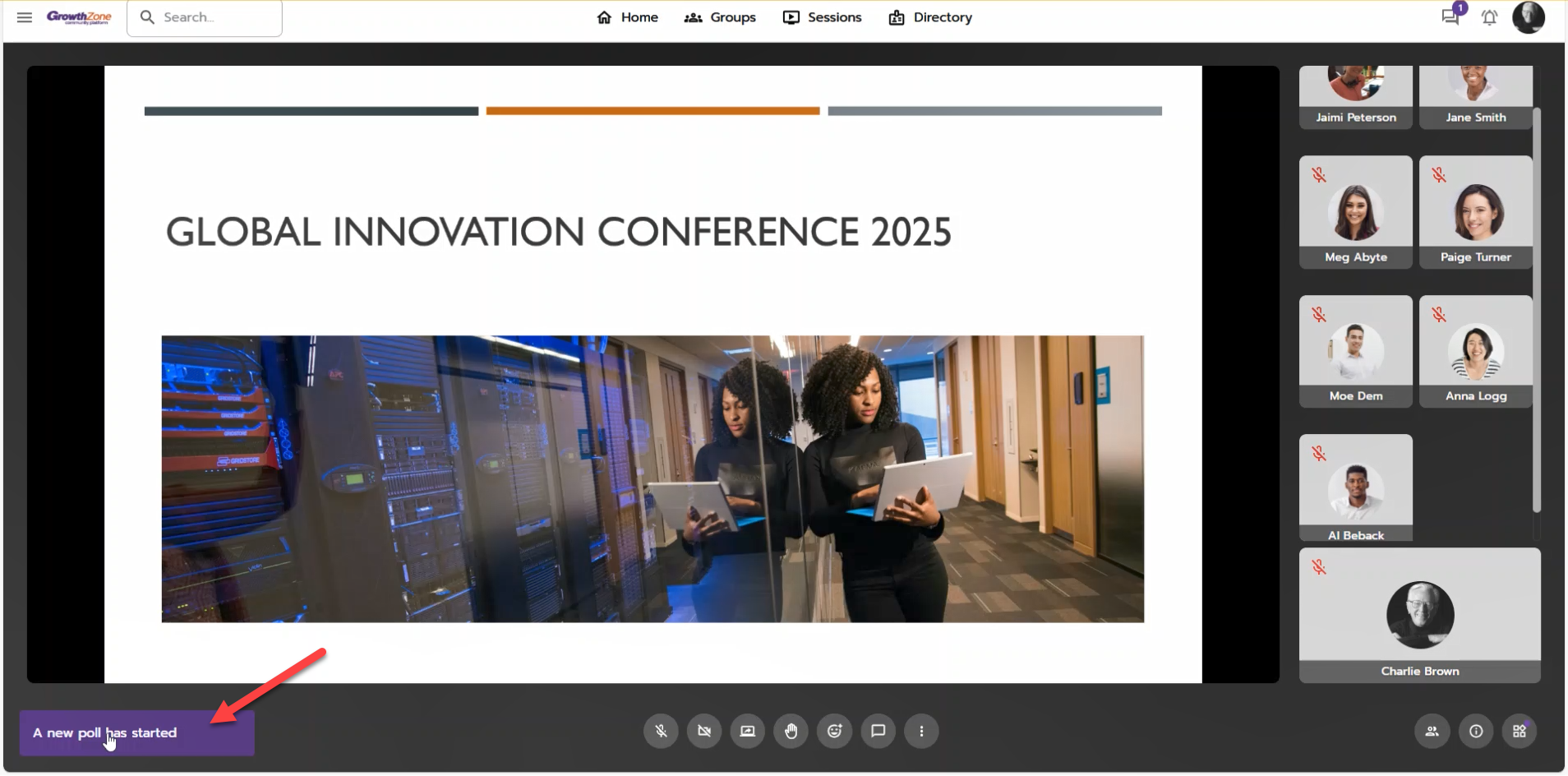 When a new poll is created, attendees receive a snack notification in the lower left corner. Clicking it brings them directly to the Polls activity tab/panel.