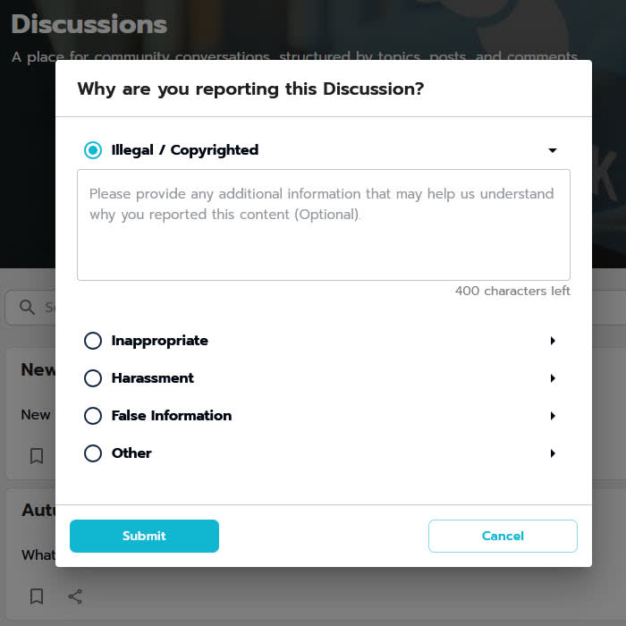 The new Moderation feature provides an option within the platform for users to report content that may be offensive, illegal, or in other ways goes against the terms of use for the platform, as well as provides a way for site and group admins to review and take action on these reported items.