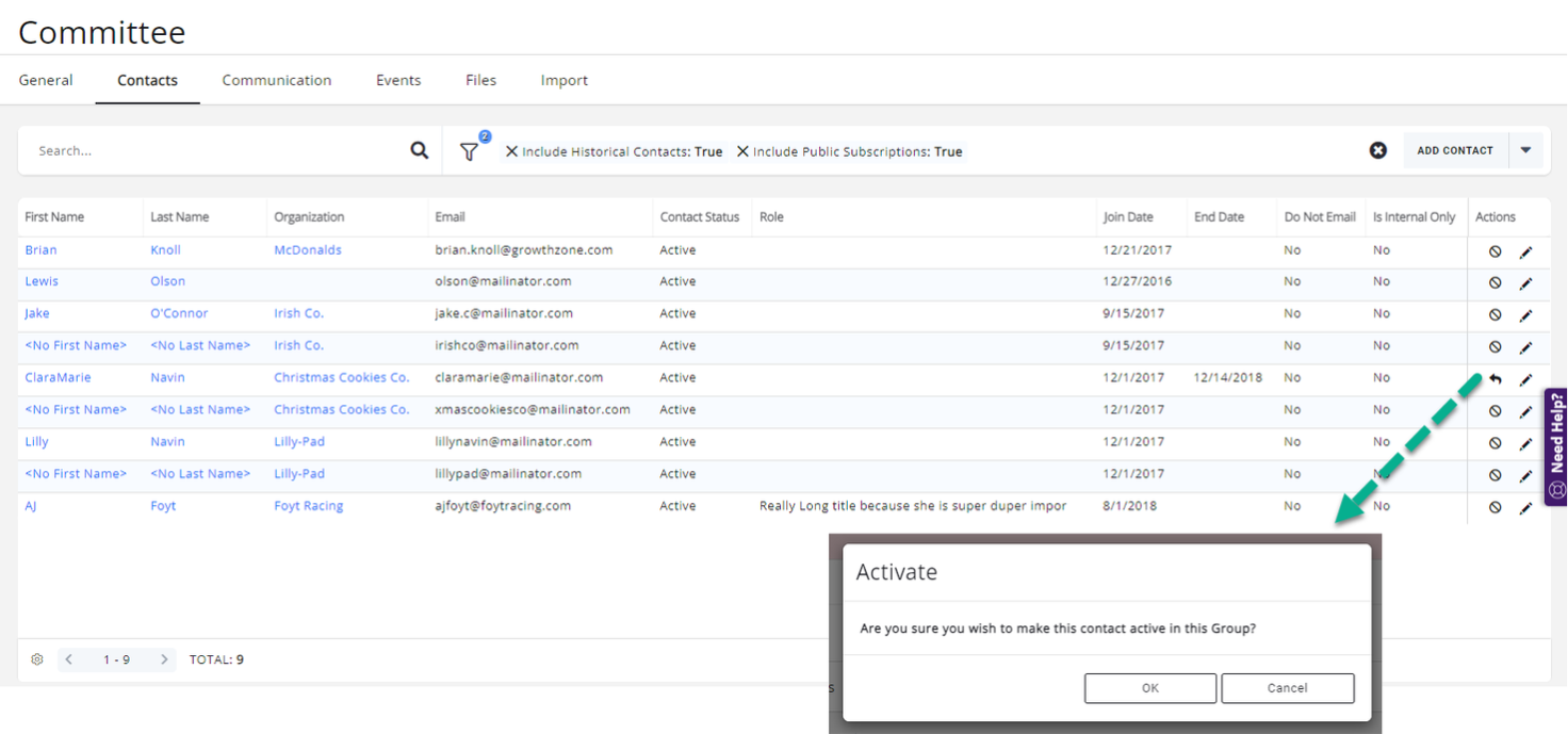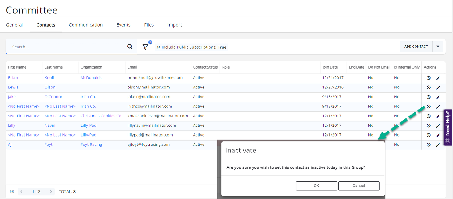 You’ll also notice that the way you change a contact to Inactive is to click the Inactivate icon in the Actions column. This will change the contact immediately to inactive, putting an End Date of today’s date. To set a future End Date, click the Edit icon and enter your desired date.