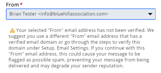 If the email domain in your From address has not passed the GrowthZone DNS verification process, the staff that sends the email will see an on-screen warning that using this “From” address is not a good idea. These emails will likely end up in the spam folder.