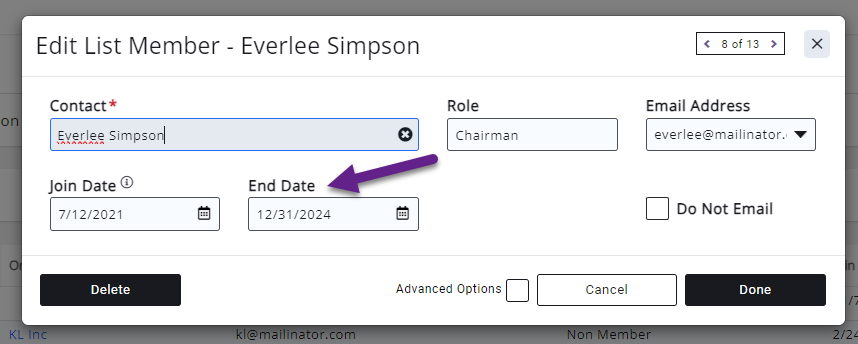 A common use of this field will be to indicate the end of the term that a committee member has. For instance, I’ve got a committee chair person that will be done with their term at the end of the year. I can put the List/Committee End Date of this contact at the year-end date, which can then display for others as well if the committee list is one that displays in the Info Hub. See KB article and look for “Users on List can view other Users on List”